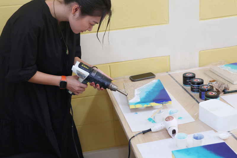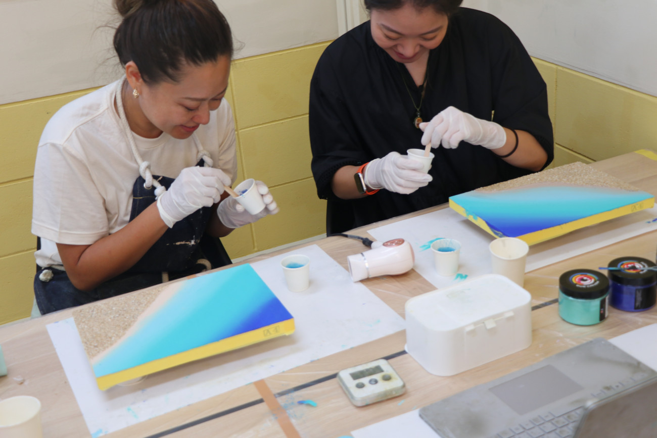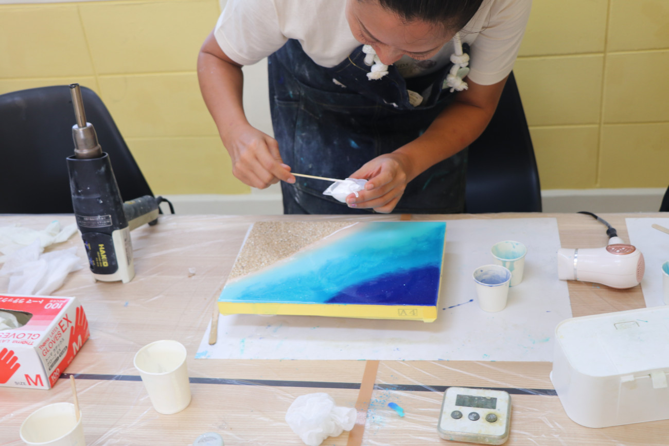 現役で活躍しているアーティストが教える本格的なレジンアート体験。3種類のアートボードからお好みのサイズを選んでいただきエポキシ樹脂(2液性レジン)を使って海を作っていただきます。