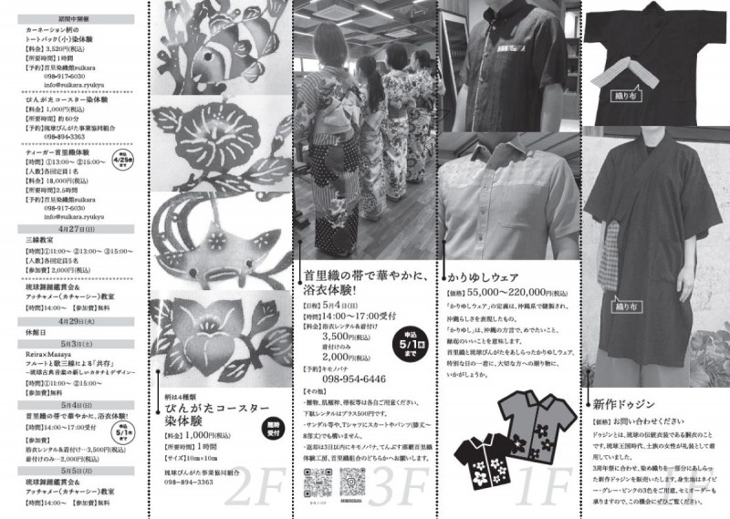 5月4日のみ首里織の半幅帯着付け体験は予約5月1日迄。琉球衣装「 ドゥジン」のセミオーダー販売。