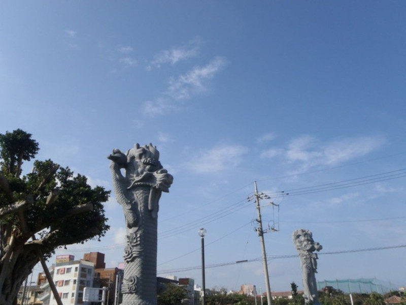 若狭に建つこのシンボル像・龍柱は、首里城正殿の龍柱から発展させた形ですが、欄干の替わりに龍が地下に潜って首里から国際通りを経て、若狭へと龍脈を作って出てきているため、台座はありません。