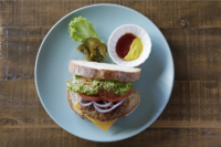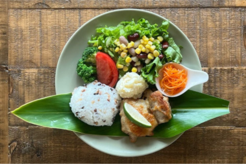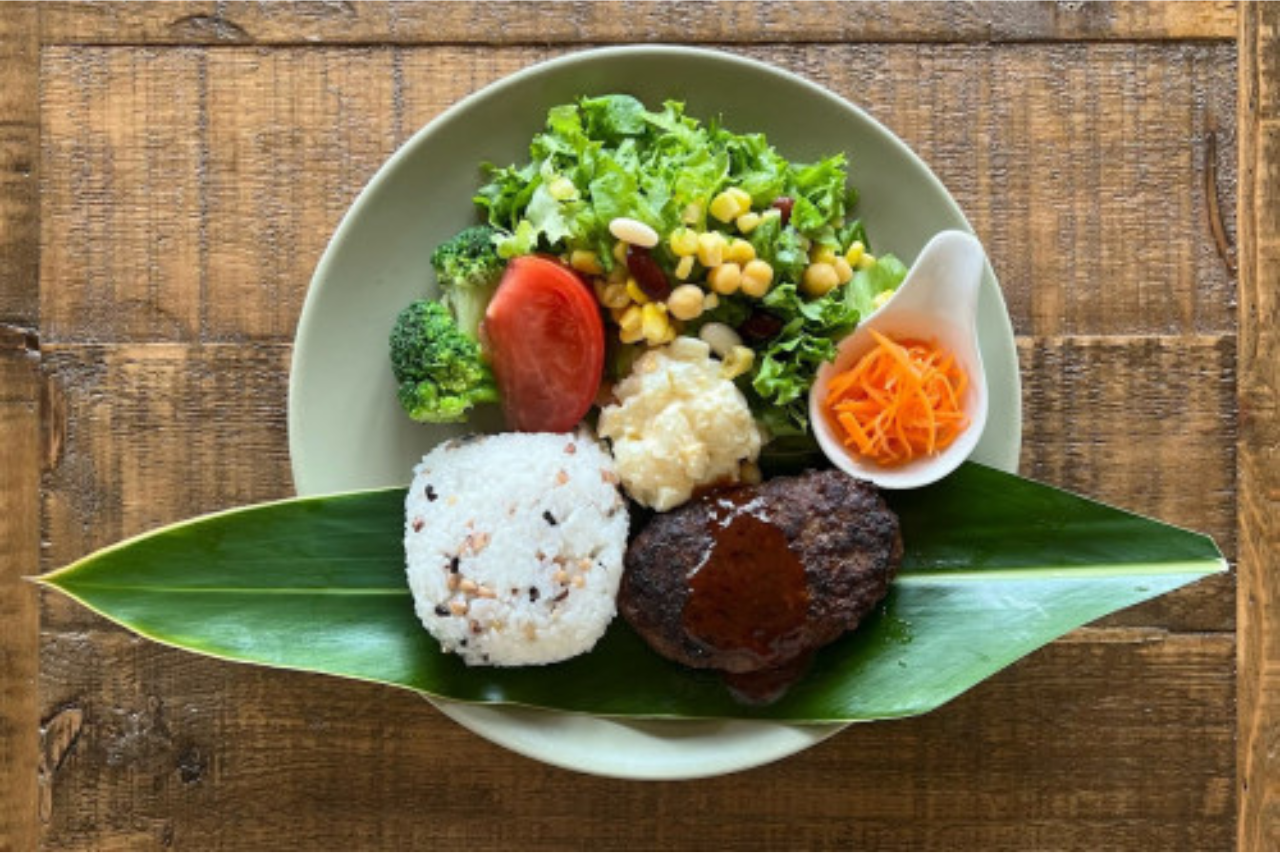ランチタイムには、黒毛和牛100%ハンバーグプレートやグリルチキンのプレートをはじめ、野菜をたっぷり使ったチョップドサラダ、ボリューム満点のタワーサンドなど、多彩なメニューをご用意。水耕栽培の無農薬野菜や、自社オーガニック農場で育てた月桃葉など、身体に優しい素材を大切にしています。