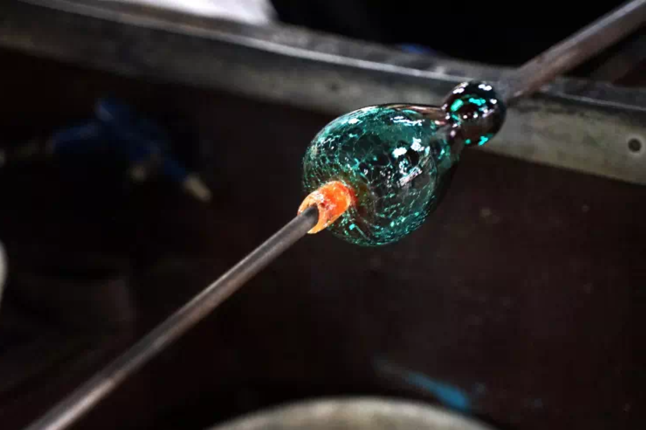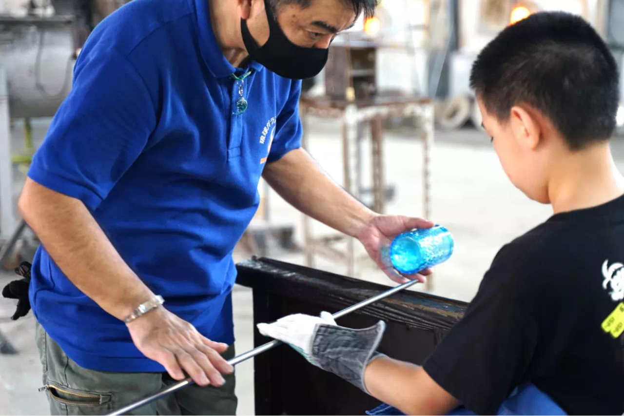 グラスづくり体験では、溶けたガラスを実際に成形し、職人と一緒に作品を完成させていきます。