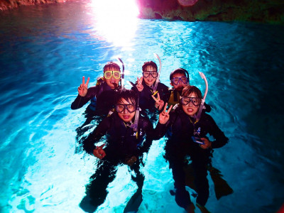 1歳からの青の洞窟子供シュノーケルが大人気。「1組完全貸切制」なのでご家族だけで楽しめます。水中写真無制限撮影&お魚エサやり体験無料