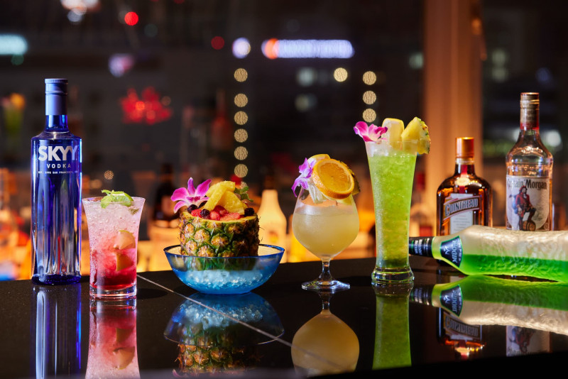 ホテル最上階のダイニングバーで美味しい食事とアルコールをお楽しみください。