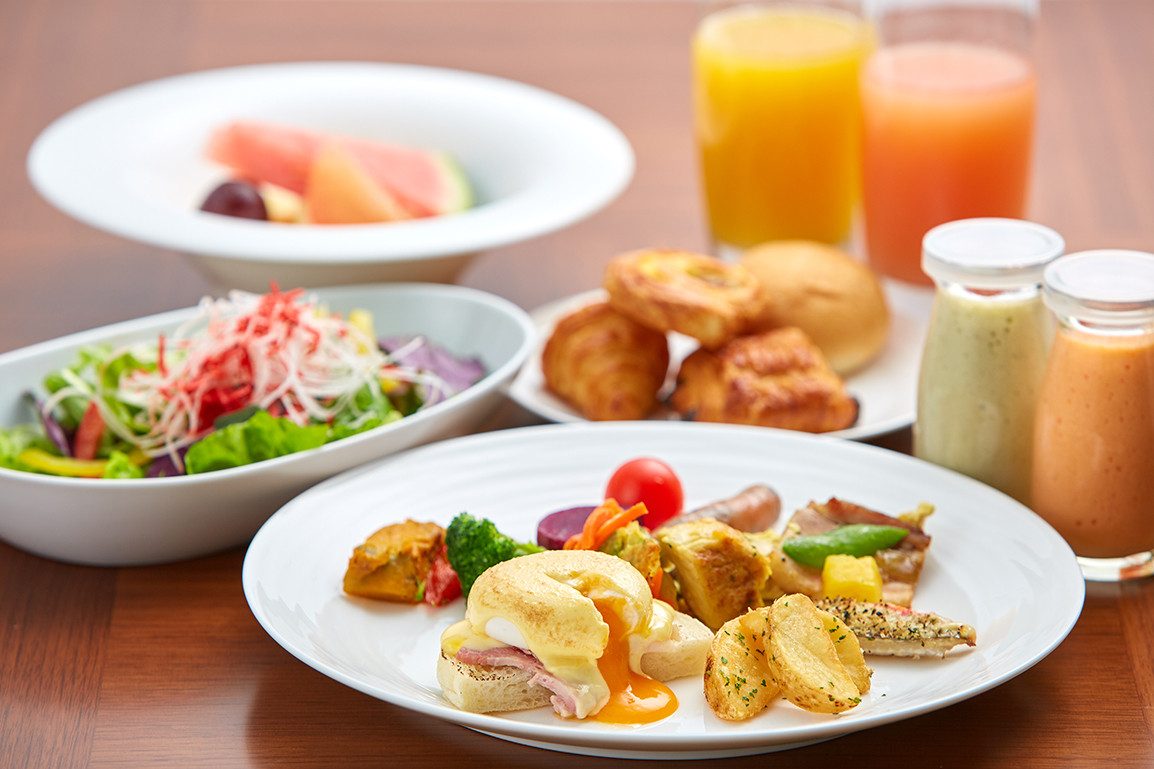 やんばるビストロ「ルアナ」の朝食ビュッフェでは、地元食材をふんだんに使った多彩なメニューをご用意。