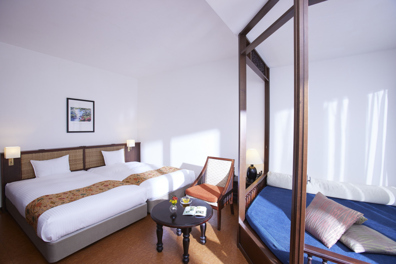 「星野リゾート 西表島ホテル」が位置する西表島は、珊瑚礁の海に囲まれ、90%がジャングルに覆われる奇跡の島。特別天然記念物のイリオモテヤマネコや群生するマングローブをはじめ、希少な生態系が残り、日本最後の秘境とも呼ばれています。「西表島ホテル」は、アウトドアアクティビティや島の文化に触れるツアーを通じて、西表島の魅力が満喫できる島最大のリゾートホテル。ごろごろできるデイベッドが供えられた部屋もあり、波の音や野鳥のさえずりに心身ともにリラックスして過ごせます。ディナービュッフェでは、カマイ(イノシシ)や、ガザミ(ワタリガニ)など、西表島で親しまれている食材が楽しめます。