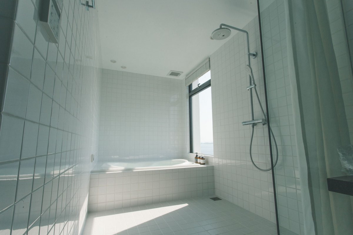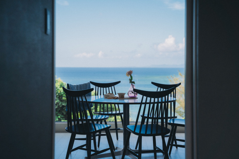 上層階リビングのパノラマ窓から見渡す景色は、エメラルドブルーの海と空のみ!まるで海外の宿にいるような客室は各階1室プライベート