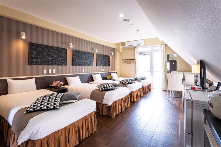 特徴として全室に、フランスベッド・バスルーム(バスタブ有り)・トイレ(温水洗浄便座付)・電子レンジ・洗濯機・ガス乾燥機・高速Wi-Fi・VOD視聴無料(150chシアター)・バスタオル・フェイスタオル・シャンプー・リンス・ボディソープ・歯ブラシ・髭剃りを備え快適な滞在をサポートいたします。またコンドミニアムタイプのお部屋(デラックスフォース・トリプル)にはキッチン、調理器具、食器を備えます。