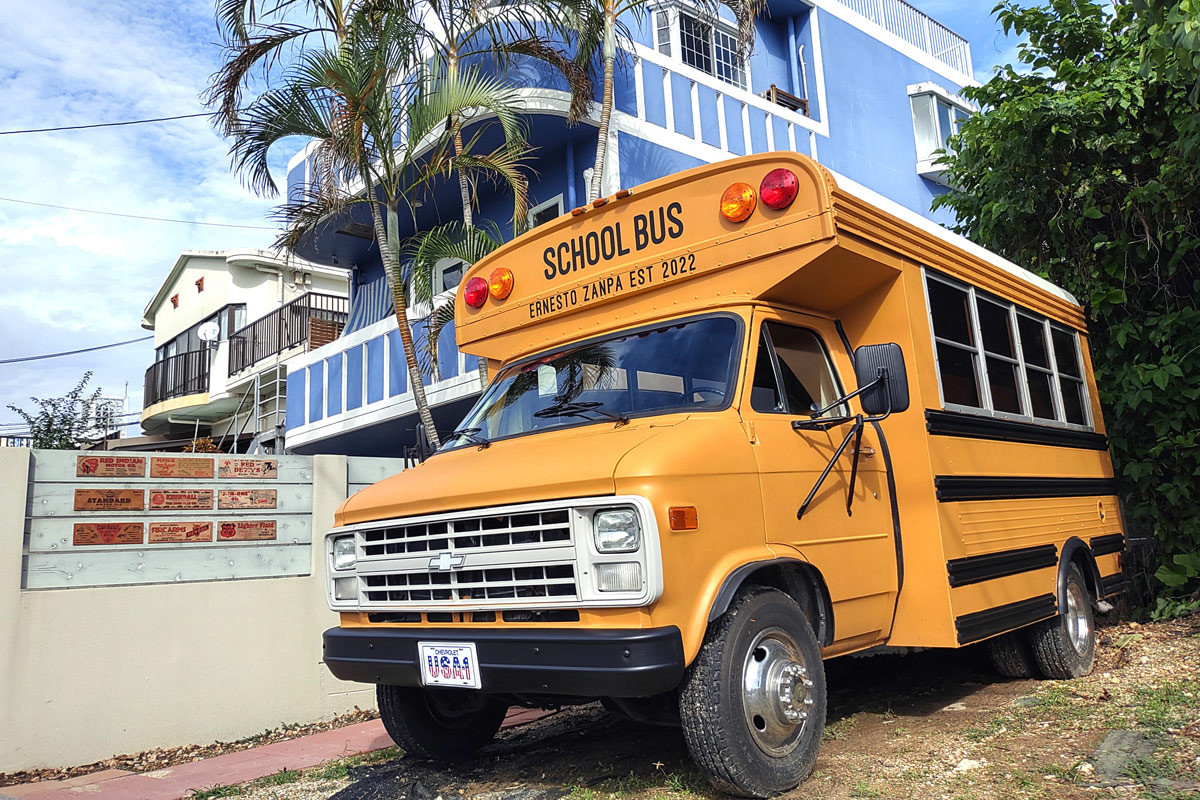 やってきたのは、1987年式シボレーのシェビーバンG30をベースに作られたスクールバス。実際にアメリカでスクールバスとして利用されていました。現在では希少なガソリンタイプで車内の高さは2m近くあるので、大人でも立ったまま移動できます。