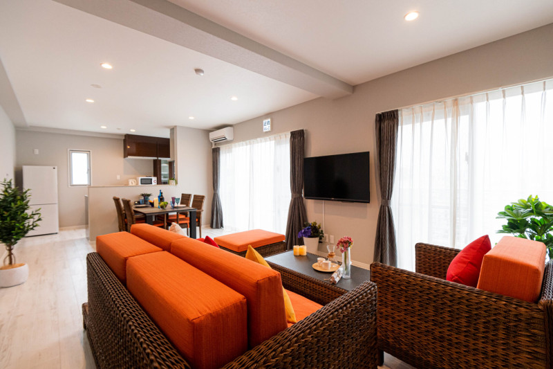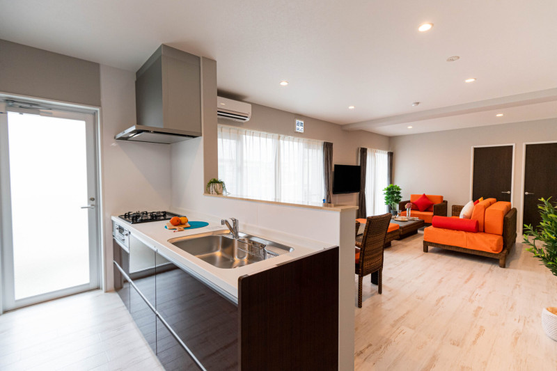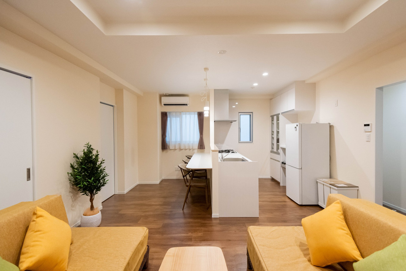 リビング・キッチン・洗濯機・乾燥機完備で長期滞在にも対応します。