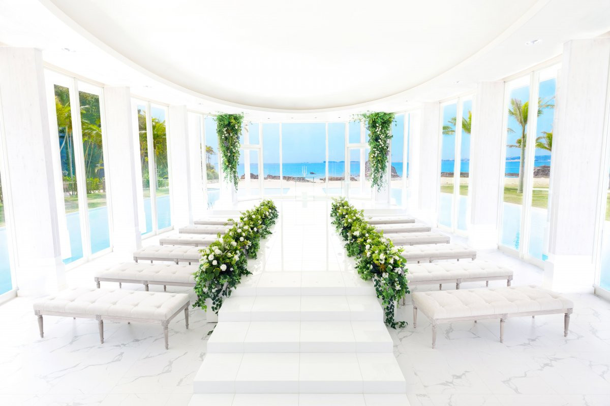沖縄で唯一無二の360度ガラス張りのオーシャンフロントチャペル。圧倒的な光に包まれるピュアホワイトの世界。