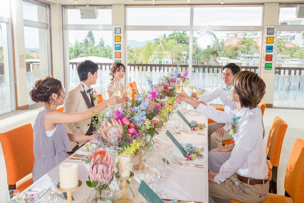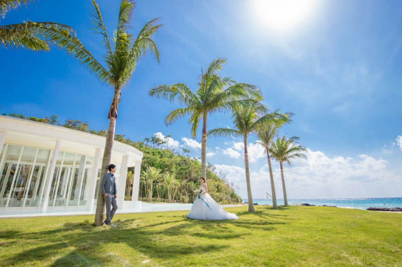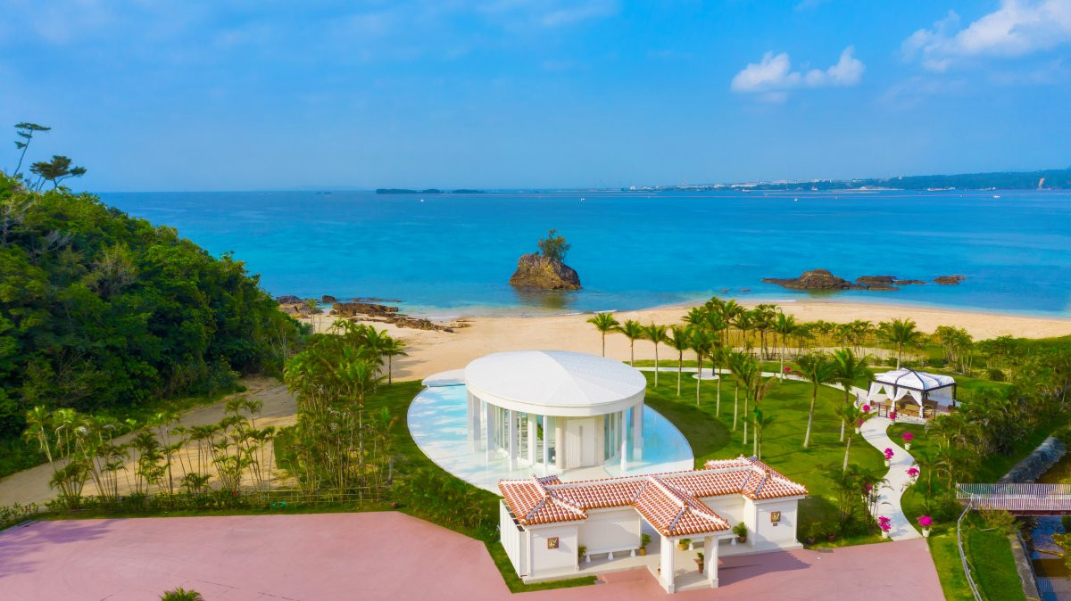 雄大なカヌチャリゾートの一角に佇むチャペルは、360度ガラス張りで、目の前に雄大な海が広がる。