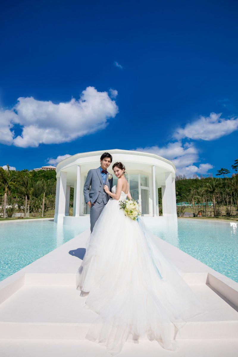 水盤に囲まれたチャペルから、海へと続く階段でゲストからのフラワーシャワー、写真撮影。青い空とのコントラストでドレス姿が映えます。